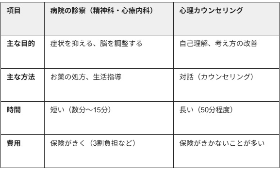 先ほども簡単に述べましたが、カウンセリングと病院の大きな違いは、